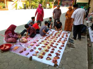 Kurban daging sapi ini kemudian dibagikan ke warga sekitar Madrasah dan siswa yang kurang mampu.