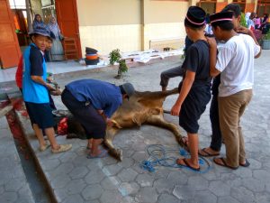 Setelah selesai Sholat Ied dilanjutkan dengan penyembelihan hewan qurban yaitu sapi.